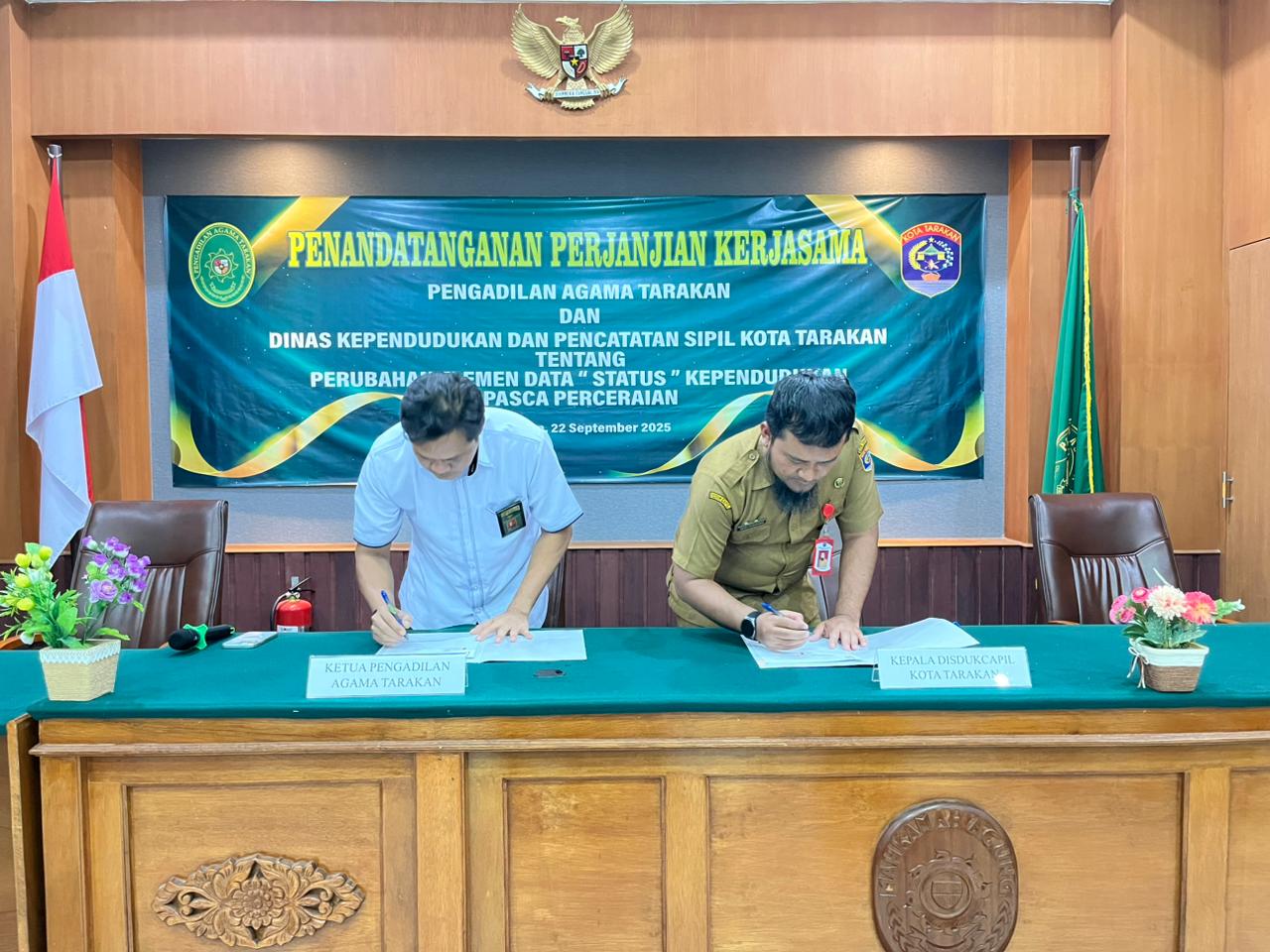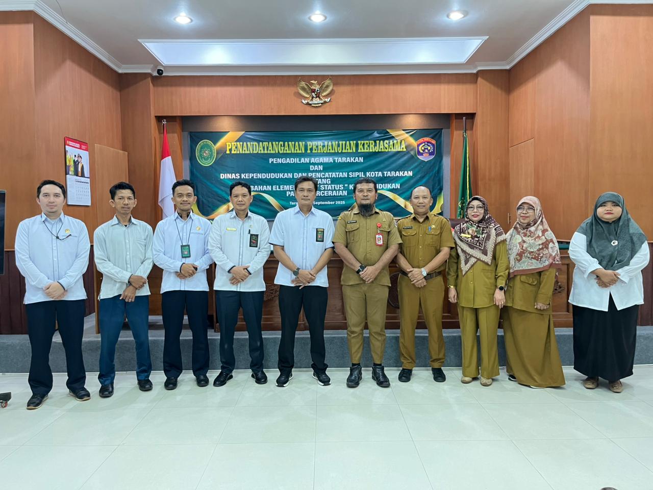 Tarakan, 22 September 2025 – Bertempat di Ruang Sidang Pengadilan Agama Tarakan, telah dilaksanakan Penandatanganan Perjanjian Kerjasama (Memorandum of Understanding/MOU) antara Pengadilan Agama Tarakan dan Dinas Kependudukan dan Pencatatan Sipil Kota Tarakan tentang Perubahan Elemen Data "Status" Kependudukan Pasca Perceraian. Acara ini bertujuan untuk untuk memberi kemudahan akses informasi untuk pembaruan data kedua belah pihak. Dalam hal penyajian data dan perubahan status dengan menggunakan sarana teknologi informasi yang merupakan layanan inovasi Pengadilan Agama Tarakan “LURUS” (Laporan Update peRUbahan Status), tidak dikenakan biaya kepada Dinas Kependudukan dan Pencatatan Sipil Kota Tarakan dalam memperoleh data. Acara ditutup dengan foto bersama.